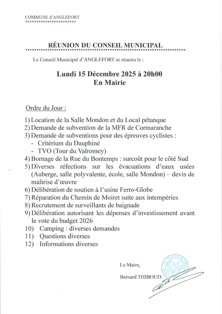CONSEIL MUNICIPAL : Le Lundi 15 Décembre 2025